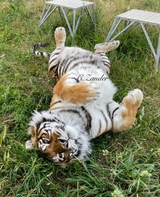 Meine Tigereltern schenkten mir am 20. April 2024 meinen ersten eigenen Nachwuchs. Ein Tigerbaby. Da es von der Tigermama ihr erster Wurf war, hat sie ihr einziges Baby nicht angenommen, was bei einer Erstgeburt normal ist. Ich rettete die kleine Tigermausi in ihren ersten Lebensstunden und zog sie selbst mit der Flasche auf. Es war eine 24/7 Arbeit. Schlaflose Nächte, stündlich Flaschi geben, Bäuchlein streicheln, Pipi und Schitti helfen... und gaaaanz viele Streicheleinheiten. Die Kosten für ihre Spezial- Aufzuchtsmilch lagen enorm hoch und mittlerweile frisst die süße Maus auch schon fast so viel wie ihre ausgewachsenen Tigereltern. Sie hat sich prächtig entwickelt und ist ein absolut, glücklicher Sonnenschein.